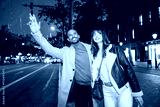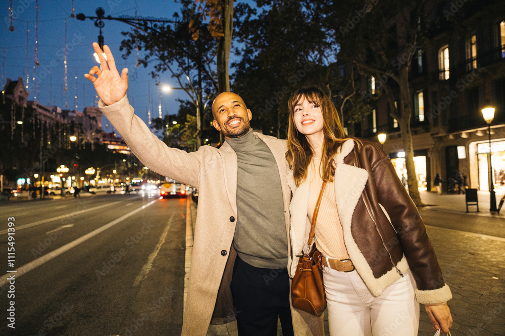 A cheerful couple standing on a city street, trying to hail a taxi as night falls. They are enjoying the lively urban atmosphere under the city lights.