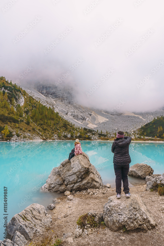 people admired the lake sorapis in the dolomites