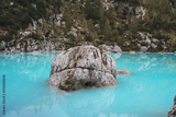 A rocky shoreline with a body of water that is blue in color lake sorapis dolomites