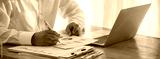 Banner Asian Businessman type keyboard write financial graph chart Planning marketing data. Banner Man hands using laptop at office desk reading spreadsheet excel finance document with copy space