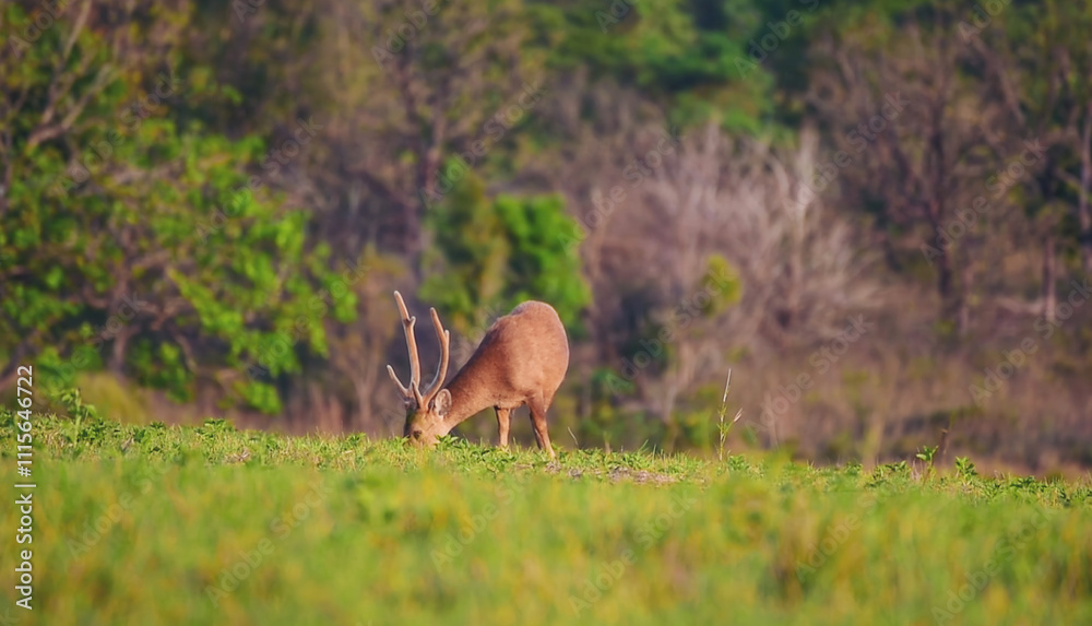 Spotted brown deer wild animal grazing grass in green national forest park on morning sunrise. Japanese deer eat green grass meadow wildlife zoo. Wilderness animal outdoors in fawn natural meadow