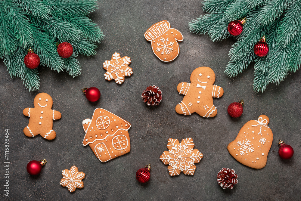 Set of Christmas gingerbread cookies on dark background, top view, flat lay