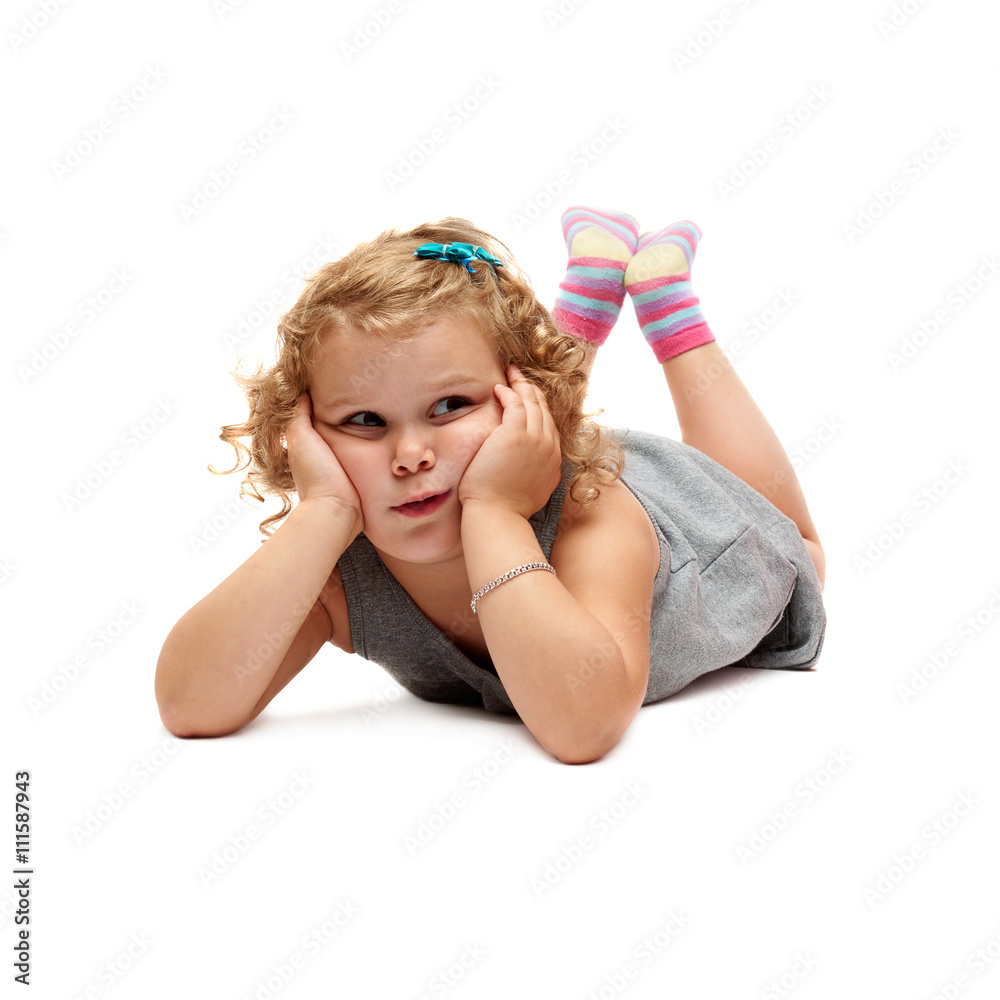 Young little girl lying over isolated white background