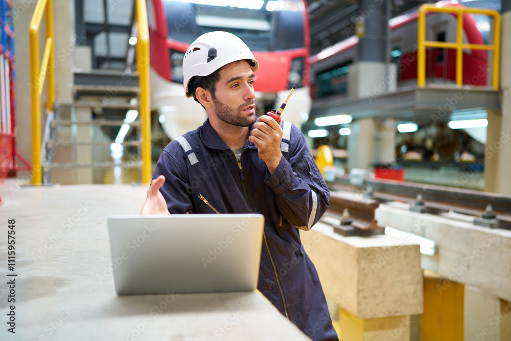 Engineer or worker working on laptop computer and talking on walkie talkie at construction train station