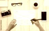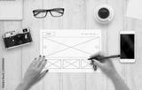 Web designer draw layout of website on paper. Top view of work desk with computer, phone, camera, glasses, coffee.