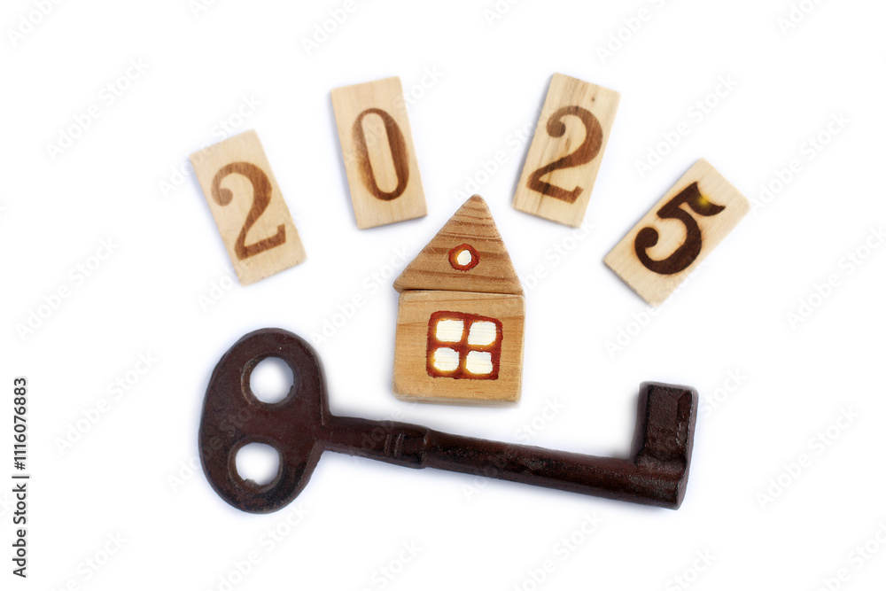 house and key with wooden numbers on light surface top view . individual real estate 2025
