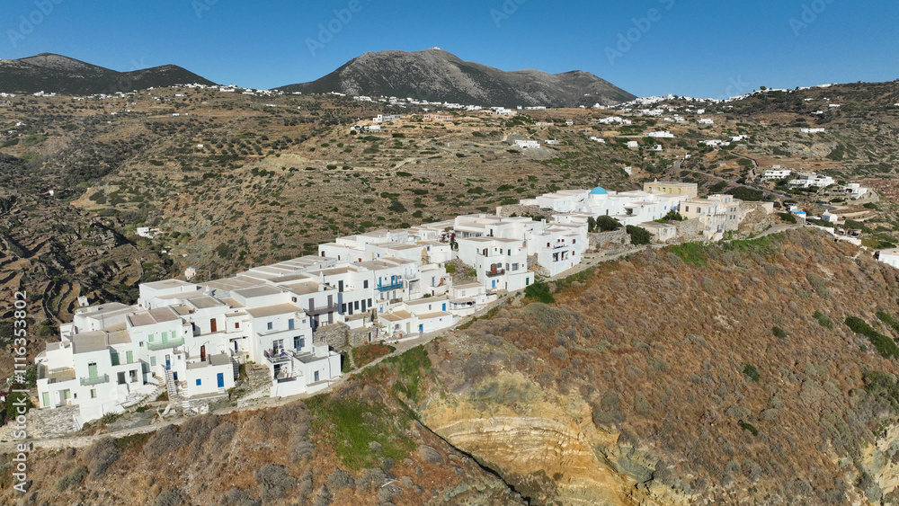 Aerial drone photo of scenic cliff-top village of Kastro or Castle built in a rock overlooking the eastern coast of the island inhabited since the prehistoric period, Sifnos island, Cyclades, Greece