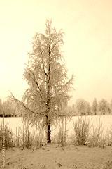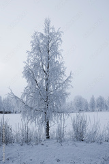 Birke mit Raureif in Lappland im Dezember