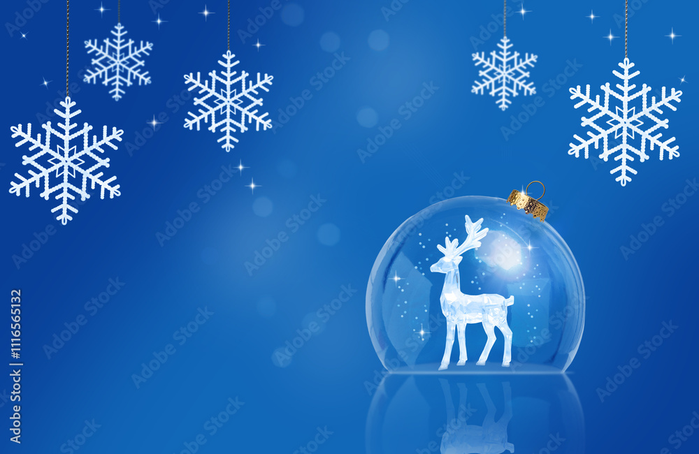 Transparent Christmas ball with an inside lion and snowflakes in a blue background.