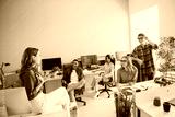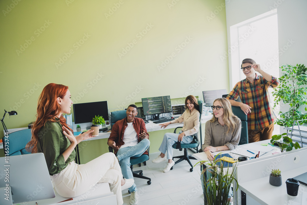 Photo of happy smiling students talking enjoying business school studying indoors workplace workstation