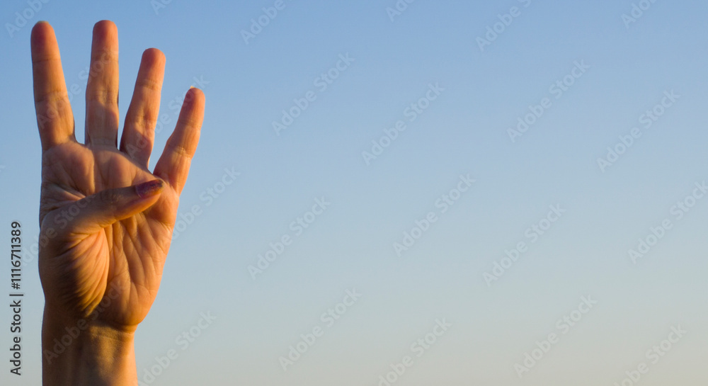 Hand showing number four gesture on blue sea sky background. Gesturing number 4 index finger. Making number four in sign language. Hand counting four. Space for ad text