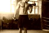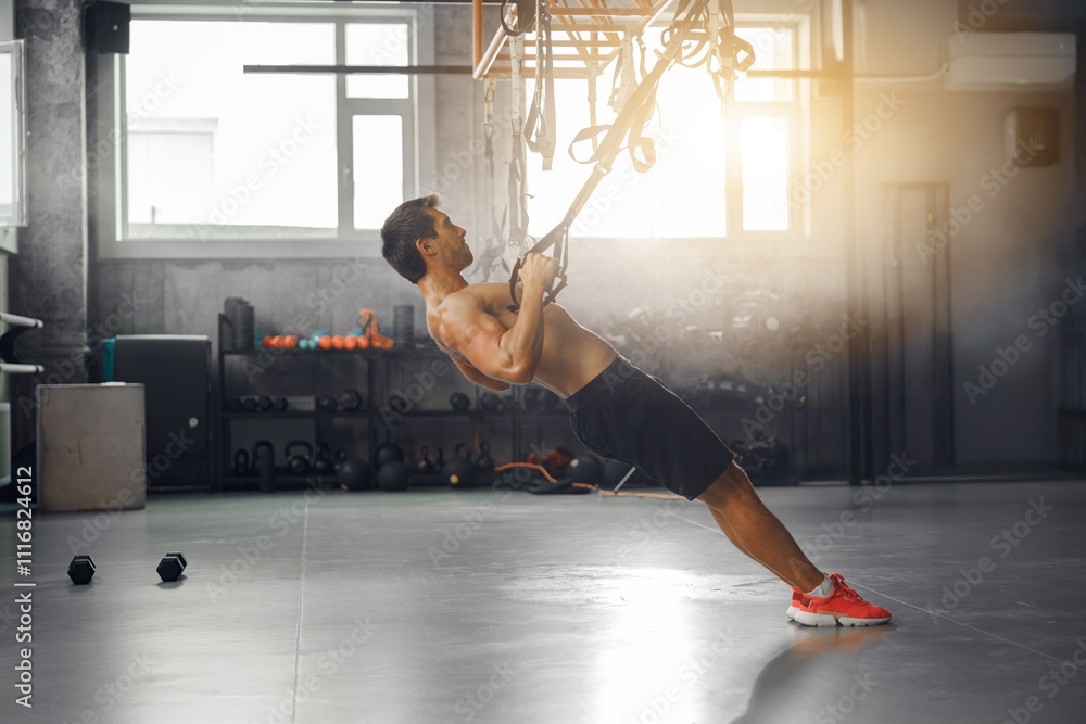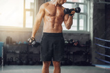 A man exercises with dumbbells in a fitness studio, showcasing his impressive physique from hard work