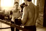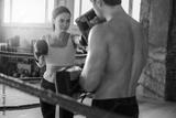 A focused and intense boxing training session showcasing both a skilled female and male athlete in action
