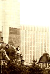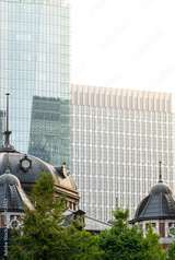 Tokyo city, vertical picture of the exterior of Tokyo Station building at golden hour during sunset with warm tones of the sunlight outdoor in the city in Japan with space for text.
