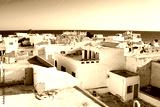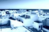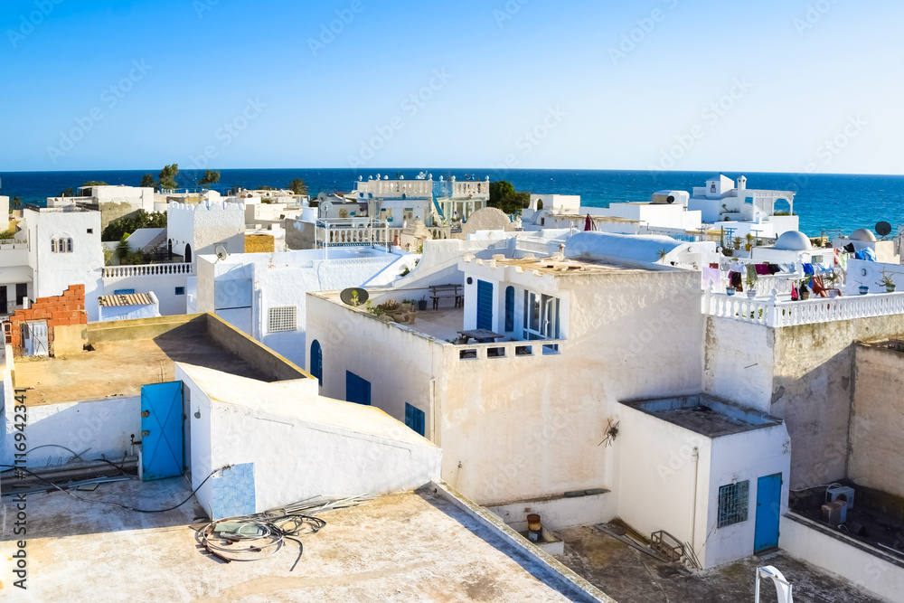 View of the roofs of white houses in the medieval medina of Hammamet, Tunisia.