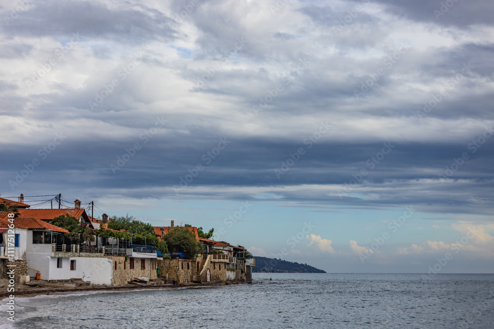 A serene coastal village with charming houses, a pebble beach, and dramatic clouds overhead. A paddle boarder adds a sense of adventure to the peaceful scene.