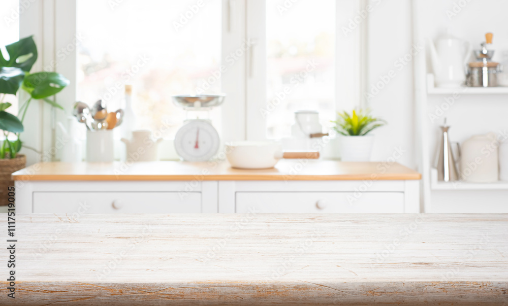 Bleached wooden table top background on blur rustic kitchen window interior background