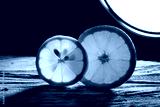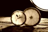 Slices of orange and lemon glowing with translucent light with light source at the background on rough wooden surface