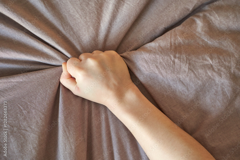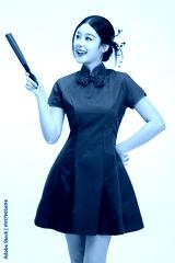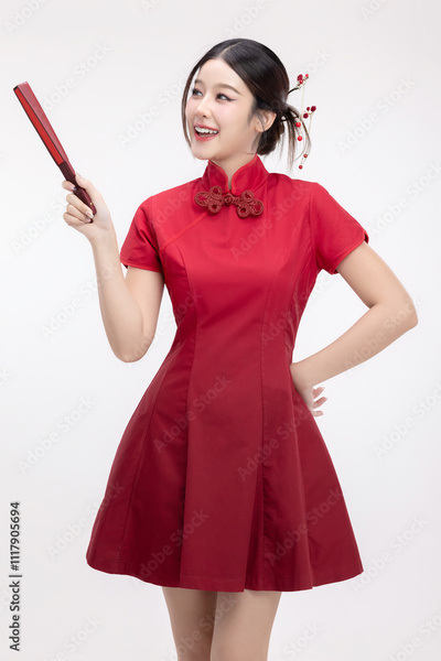 Portrait of joyful beauty Asian woman in red Cheongsam Chinese traditional dress pointing red fan for Chinese New Year festival content.