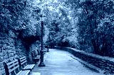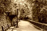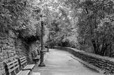 scenic beautiful view of nature in fort tryon park manhattan new york city (nyc public parks with bridges, benches recreation) landscaping (bench bridge overpass) grass vines trees tree hinoki cypress