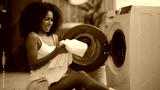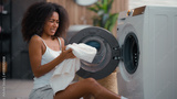 African American female woman girl ethnic lady housewife homeowner housework at floor open washing machine smell clean white towel cloth bad smelling sniff terrible aroma laundry conditioner gel stink