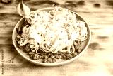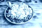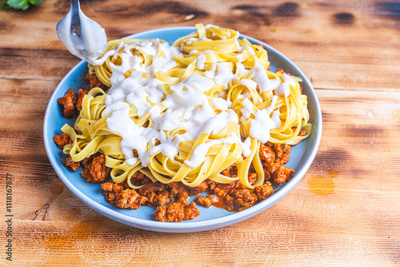 Spaghetti Bolognese pasta nests with Bechamel sauce and minced beef fried with tomatoes, onions and carrots on a blue plate on a wooden table. Top view. Copyspace or space for text.