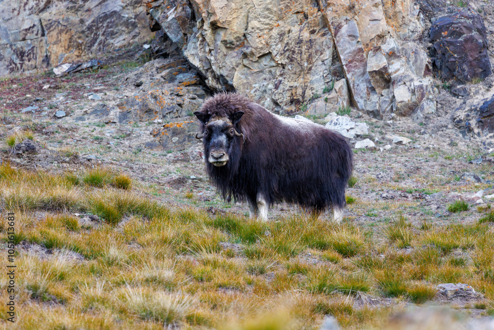 Blue glacial iceberg at the edge of the fast ice, Nordfjorden fjord. Svalbard. Mountains and blue sky with wispy clouds background.
