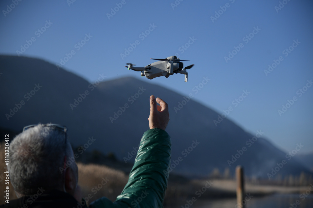 Drohne fliegt am Himmel und Mann hält die Drohne