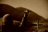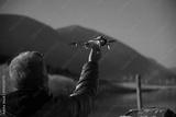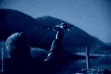 Drohne fliegt am Himmel und Mann hält die Drohne