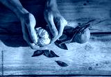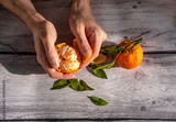 The beautiful hands of a young man are peeling a tangerine on a wooden table, next to the table there is a whole tangerine with a twig and leaves. Close-up.