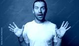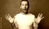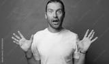 looking surprised and shocked, with jaw dropped holding an object with an open hand on the side