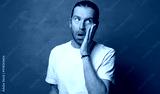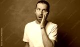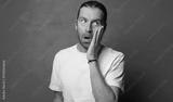 smiling cheerfully and casually, looking downwards and pointing to chest
