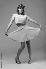 Woman in yellow dress with red wreath dancing on gray