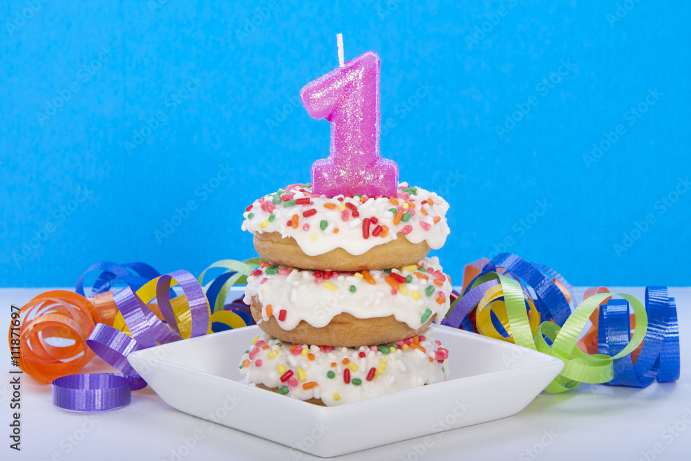 miniature cake donuts with rainbow sprinkles on white plate with one pink candle. Perfect size for toddler preschool children.