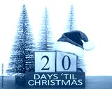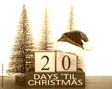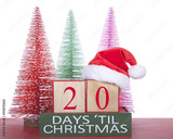 Festive count down to Christmas, Colorful pine trees behind wood blocks with santa hat, 20 days til Christmas
