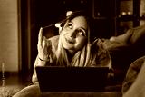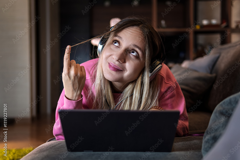 A cheerful girl is relaxing at home on the couch. young woman wearing headphones and listening to music from laptop computer after work on sofa