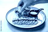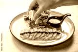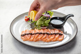 A hand squeezing lemon juice over salmon sashimi with salad and a side of dressing.