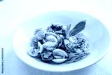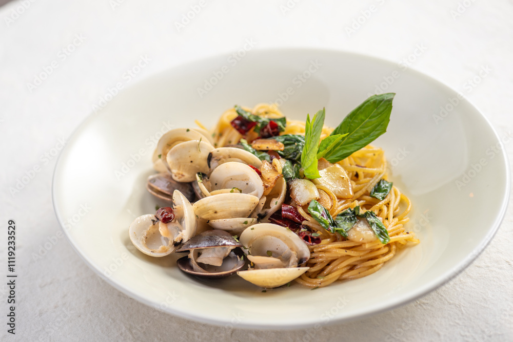 A plate of spaghetti with clams, garlic, and herbs. The dish is served on a white tablecloth with a fork and knife. The food looks fresh and delicious.