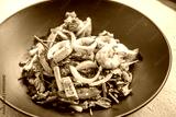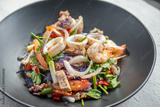 A plate of spicy Thai seafood salad with squid, vegetables and glass noodles.