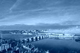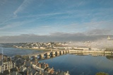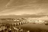 Glimmering waters reflect a tranquil morning over the historic town by the river under a soft mist