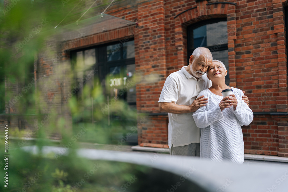 Remote shot of cheerful senior couple enjoying coffee standing on city street, embracing simple joys of life together, radiating love, happiness and contentment. Concept of active aging.
