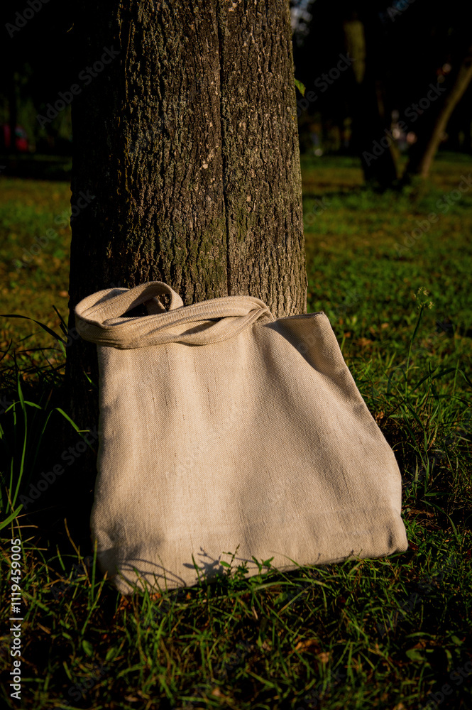 White canvas tote bag mockup template with long handles among the green plant leaves near the tree outdoor