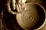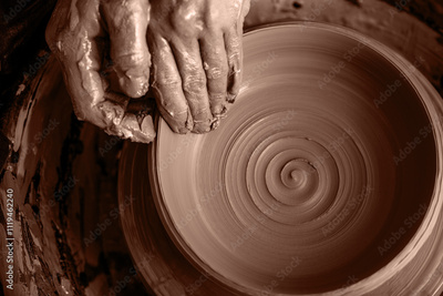 Potter shaping clay on the pottery wheel. New trending colour of the 2025 year