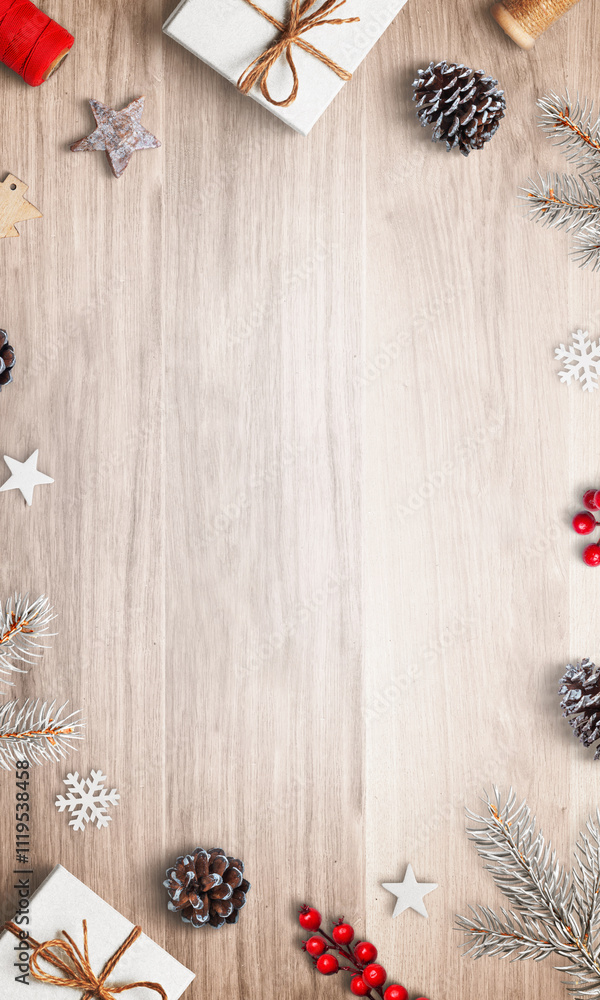Top view Christmas composition with gifts and decorations at the top and bottom, featuring an empty space in the center, perfect for holiday greetings