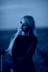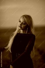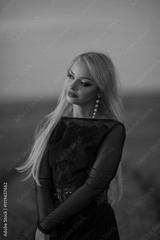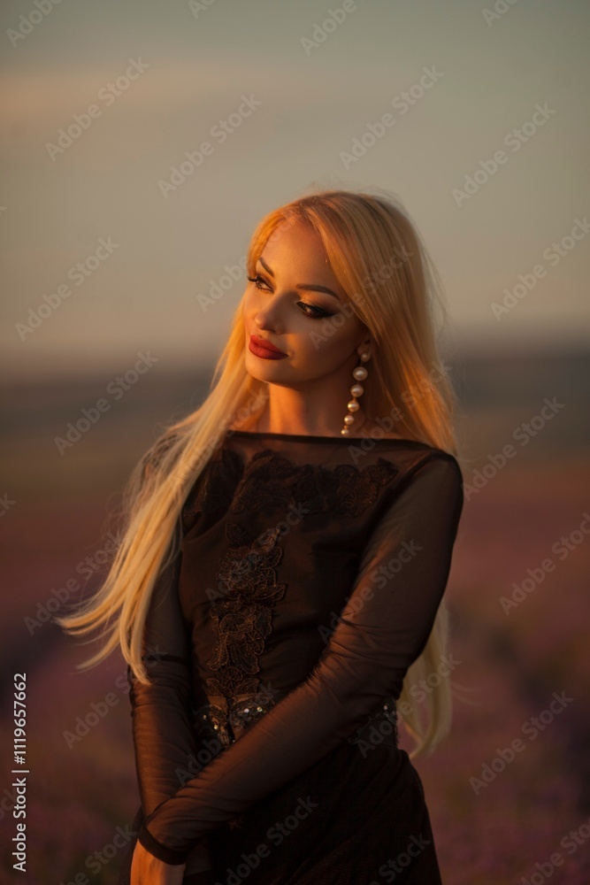 Happy carefree woman in black dress and wide-brimmed hat in lavender field