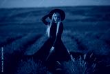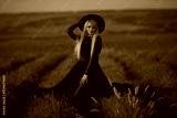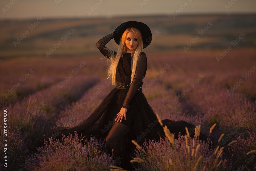 Happy carefree woman in black dress and wide-brimmed hat in lavender field