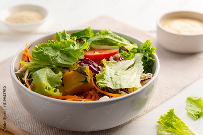 Mix vegetable salad in white bowl and mayonnaise salad dressing on white table.