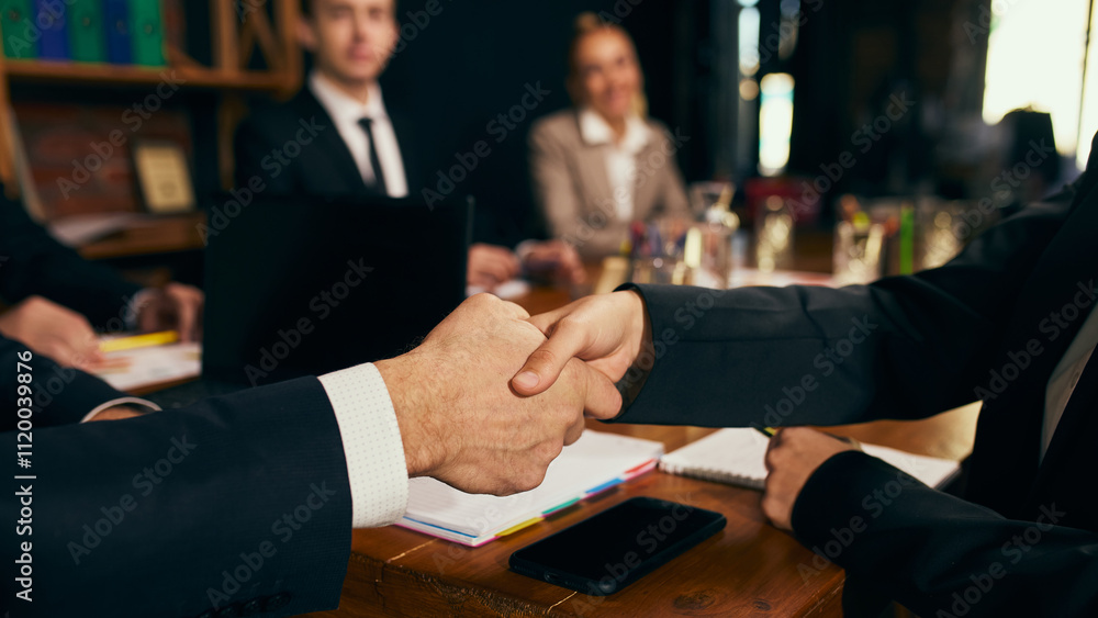 Close-up of two professionals shaking hands across conference table, symbolizing successful teamwork and collaboration. Partnership, professional growth. Concept of business, success, achievement