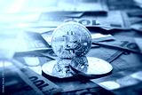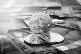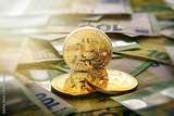 Bitcoin against the background of euro bills. Cryptocurrency - concept.