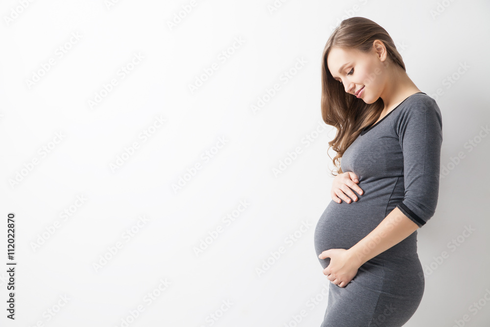 Isolated portrait of beautiful smiling woman in dress waiting for baby